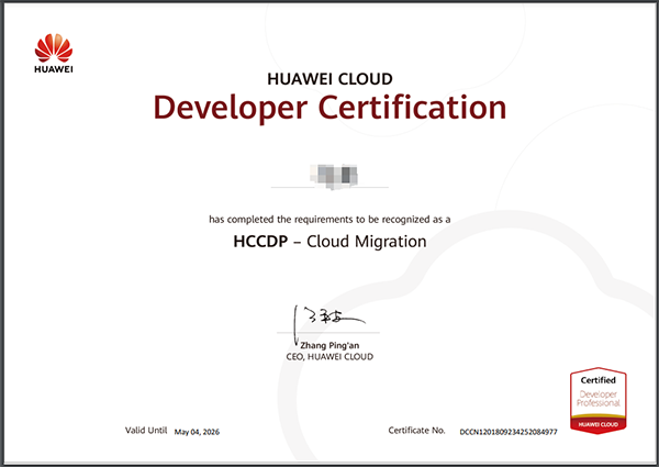 经过培训赋能和考试认证,upay钱包官网技术华为云事业部已有18人获取华为云开发者-云迁移HCDDP-Cloud Migration证书。